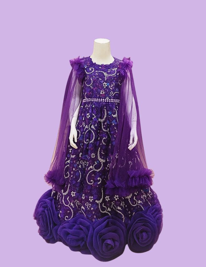 Crafted with love and attention to detail, the gown features a luxurious, full-length flared skirt made with layers of soft net and satin for a dreamy silhouette. The fitted bodice is adorned with delicate embellishments such as lace, sequins, or floral appliqués (design may vary), adding a touch of sparkle and sophistication. A soft inner lining keeps the dress breathable and gentle on your child's skin, ensuring all-day comfort while twirling, dancing, or posing for pictures.